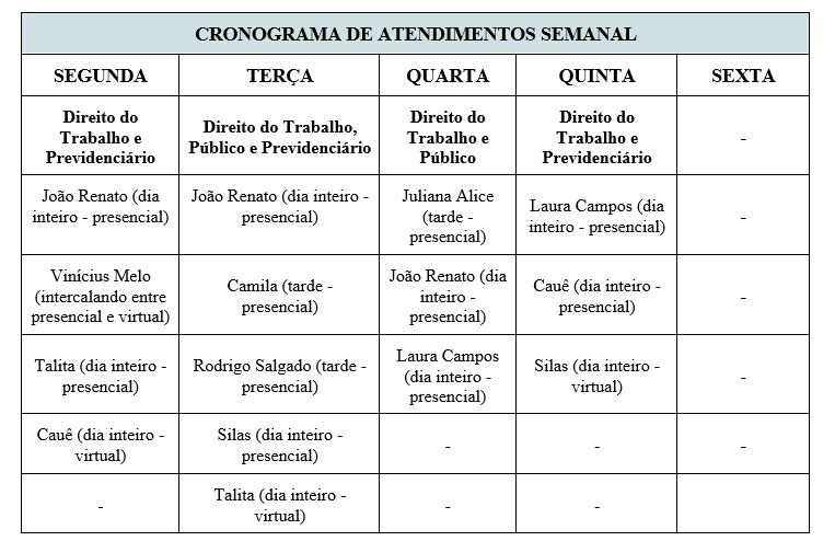 Os atendimentos ocorrem de forma presencial ou virtual, através do Aplicativo Zoom.