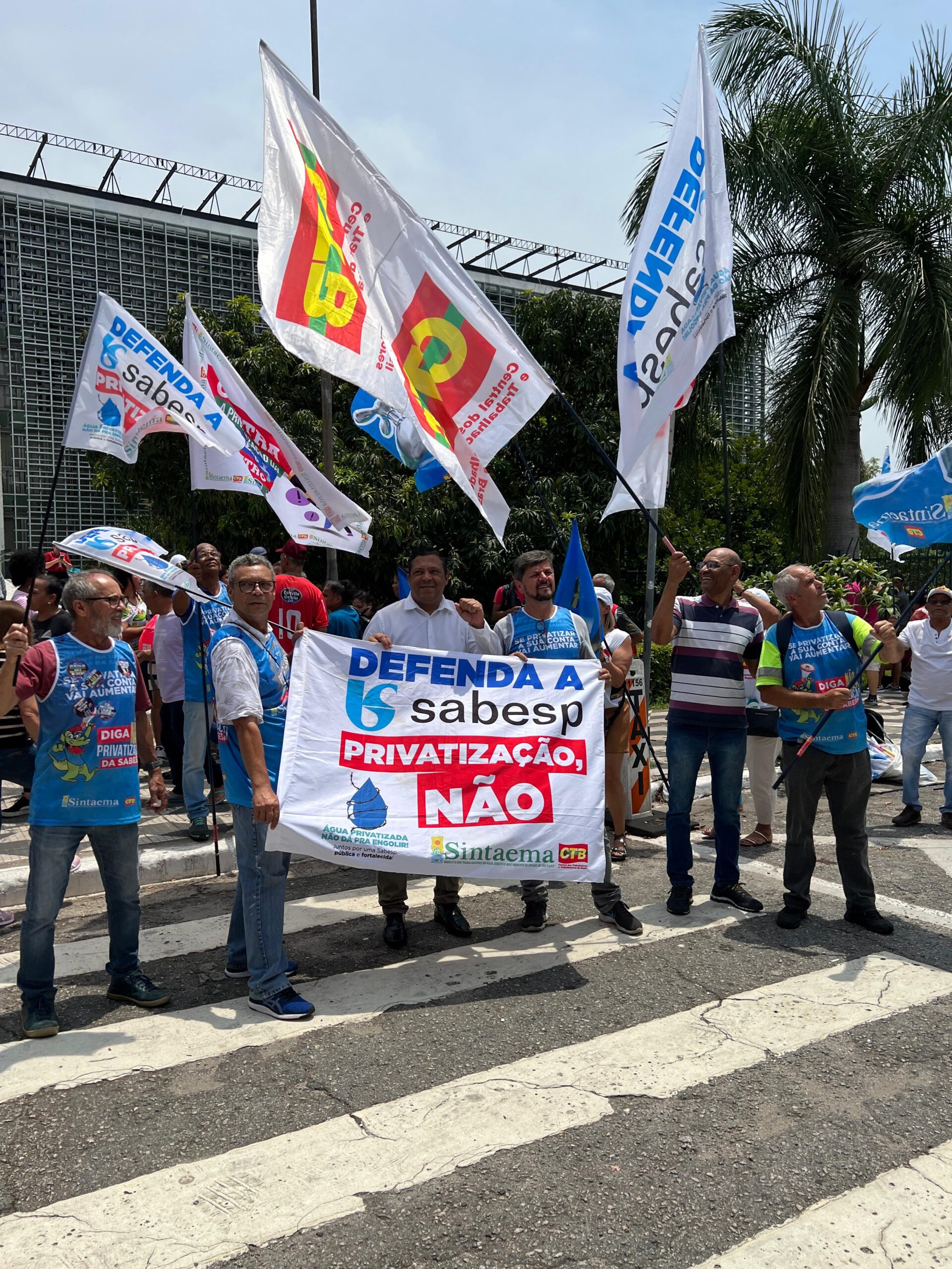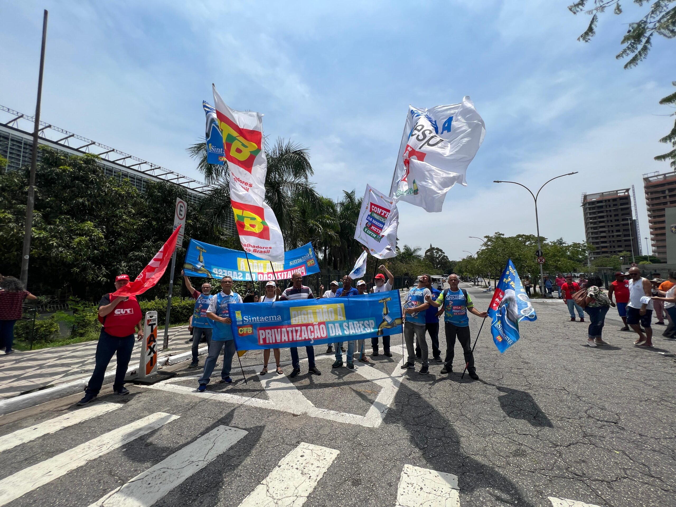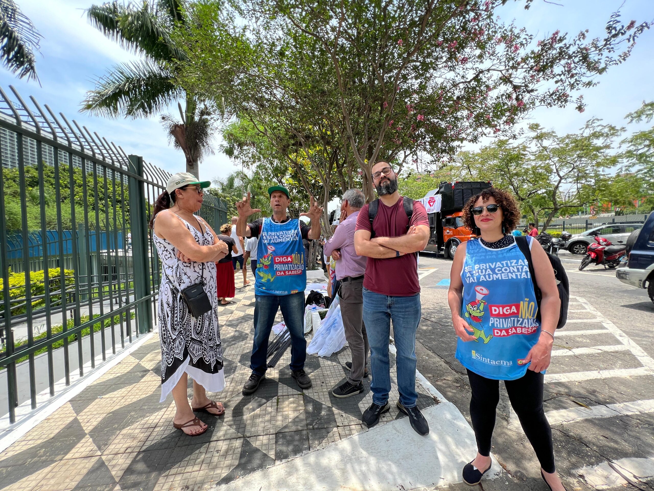 Trabalhadores (as) do saneamento, metroviários, ferroviários, professores (as), movimentos sociais e parlamentares estiveram em frente à Alesp (na entrada ao lado do estacionamento) nesta quinta-feira (16) protestando contra a privatização da Sabesp.