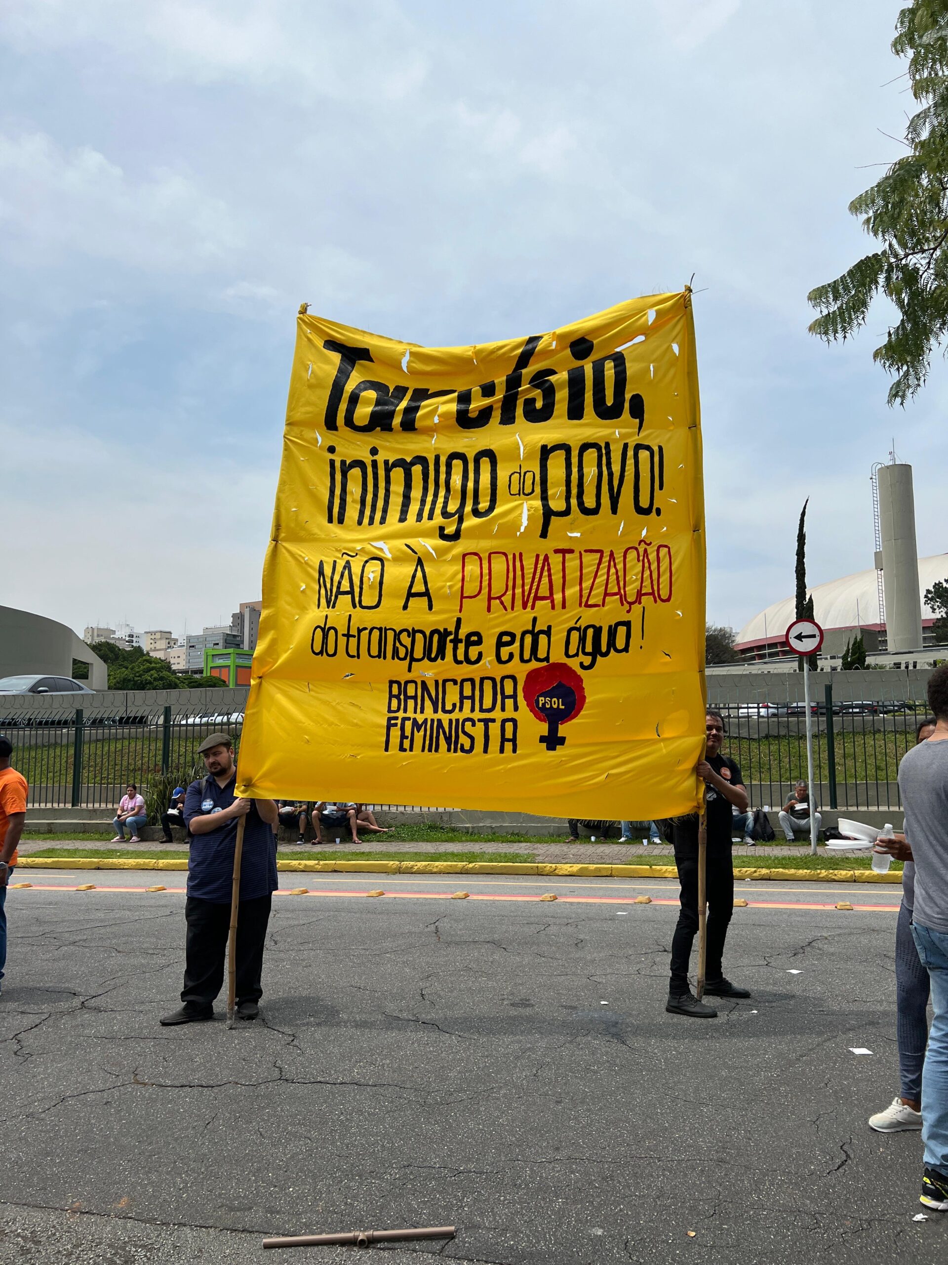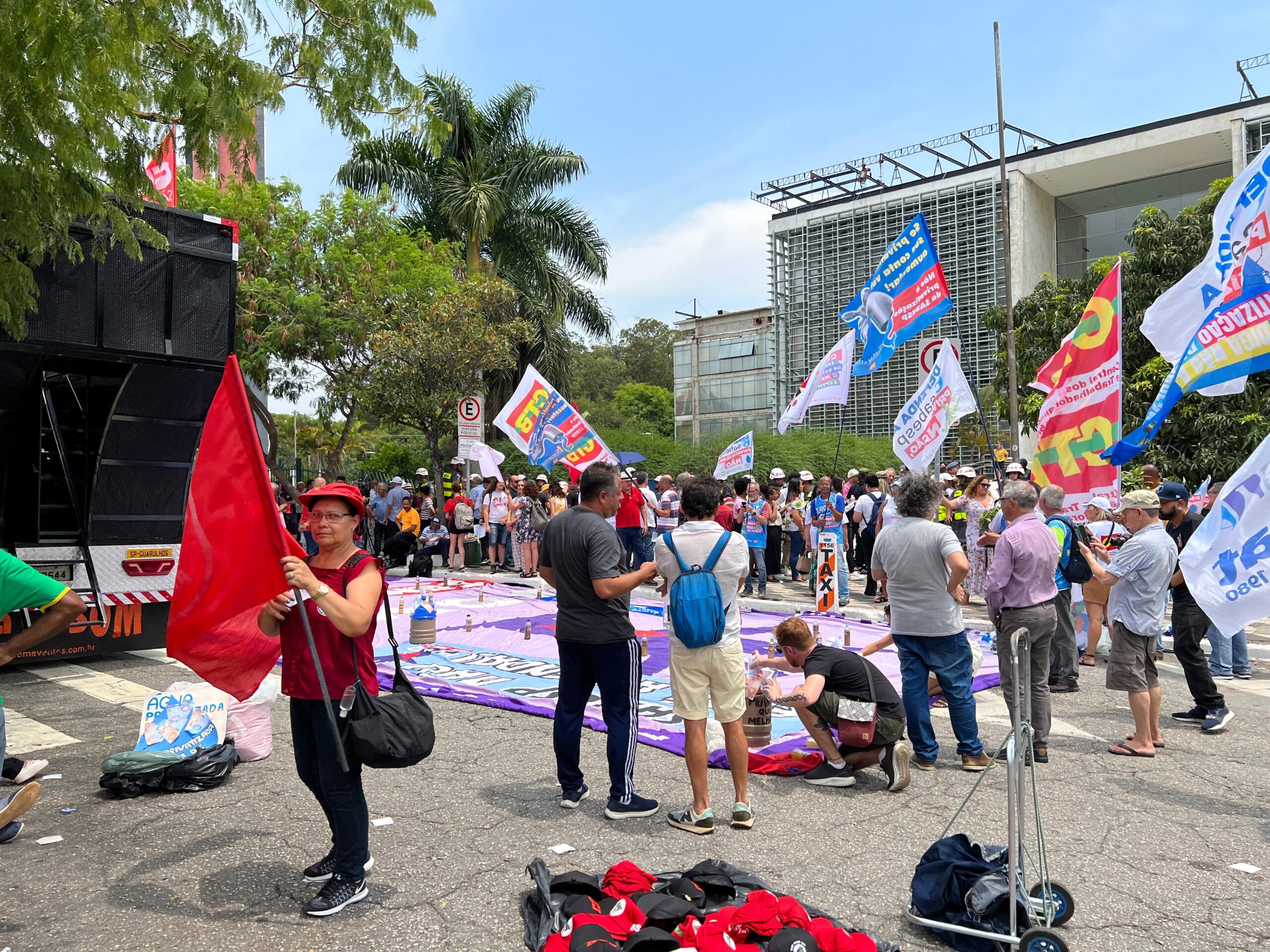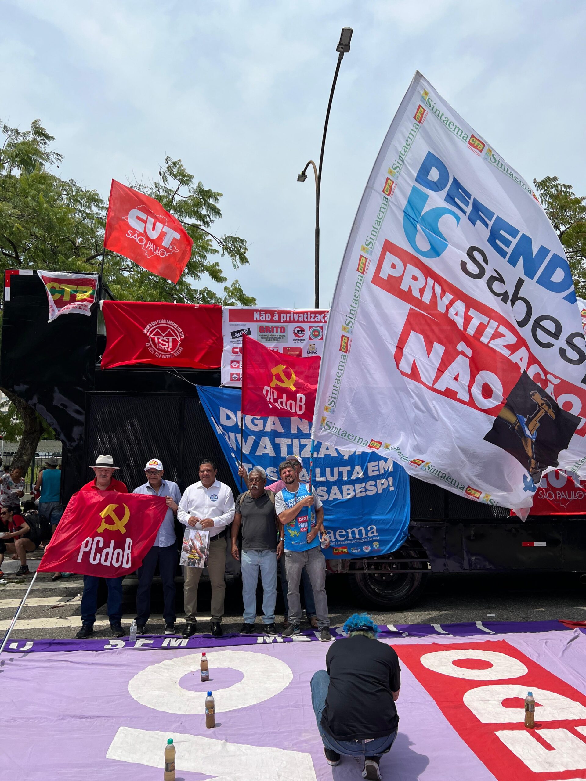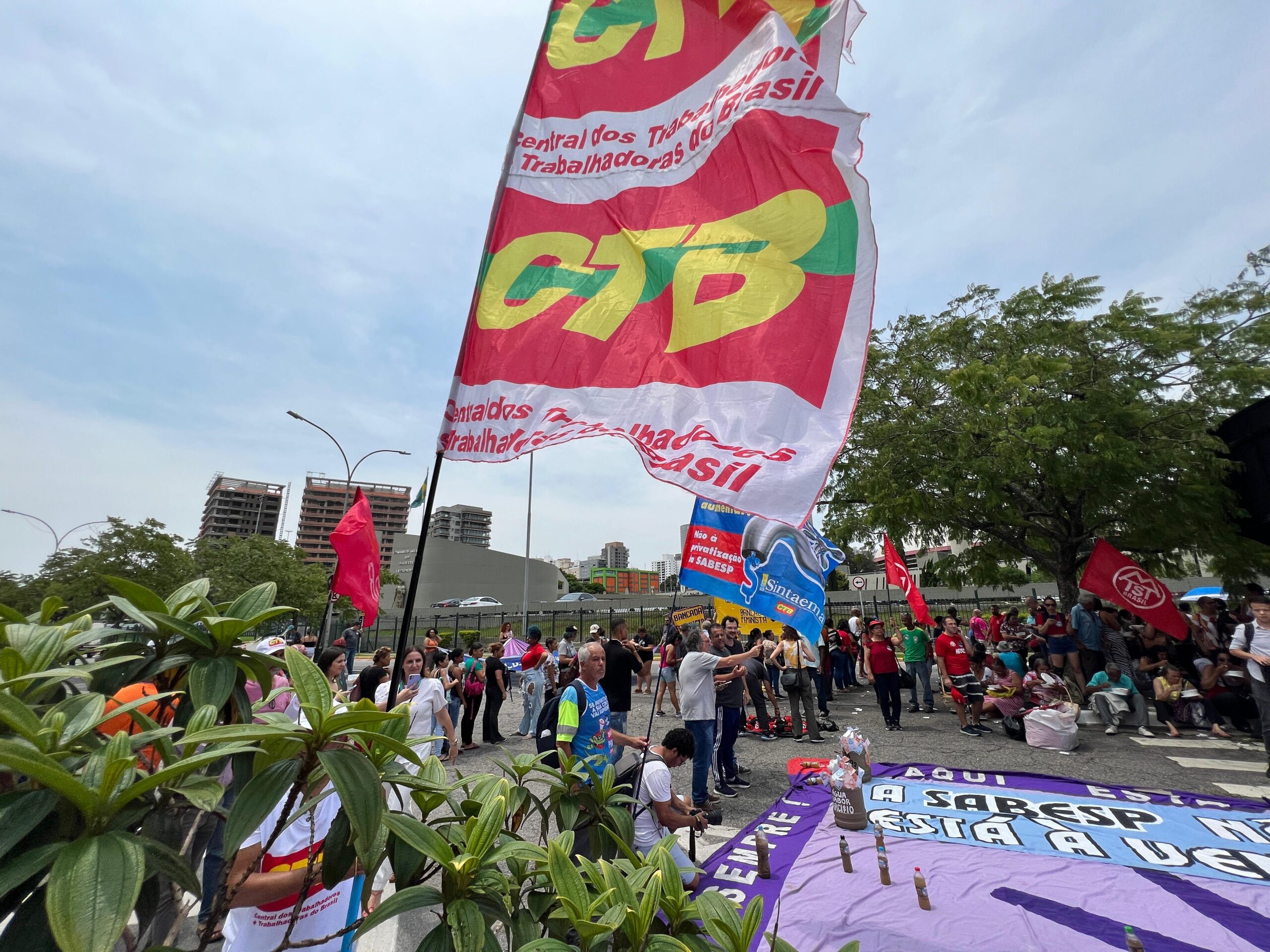 Trabalhadores (as) do saneamento, metroviários, ferroviários, professores (as), movimentos sociais e parlamentares estiveram em frente à Alesp (na entrada ao lado do estacionamento) nesta quinta-feira (16) protestando contra a privatização da Sabesp.