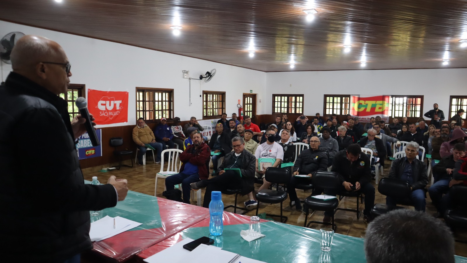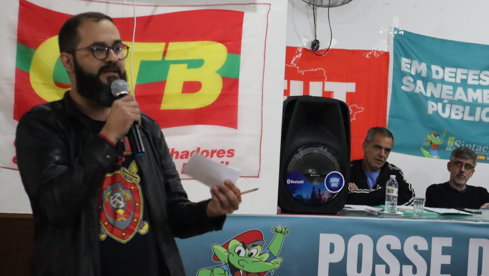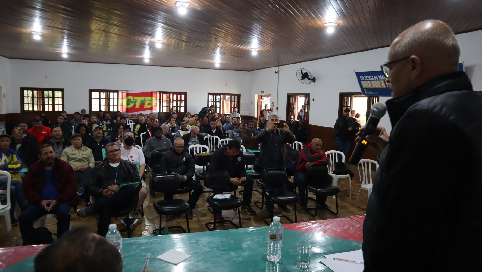 Na mesa de abertura, o presidente do Sintaema, José Faggian, criticou a aprovação do marco temporal (que na prática abre espaço para a devastação dos territórios originários) e falou sobre a ofensiva do governo Tarcísio contra os serviços públicos e a ameaça de privatização da Sabesp. Também foi tema do debate inicial o balanço das campanhas salariais (Sabesp, CETESB, Fundação Florestal, SAEG e empresas privadas) e a importância de organizar a luta pela base.