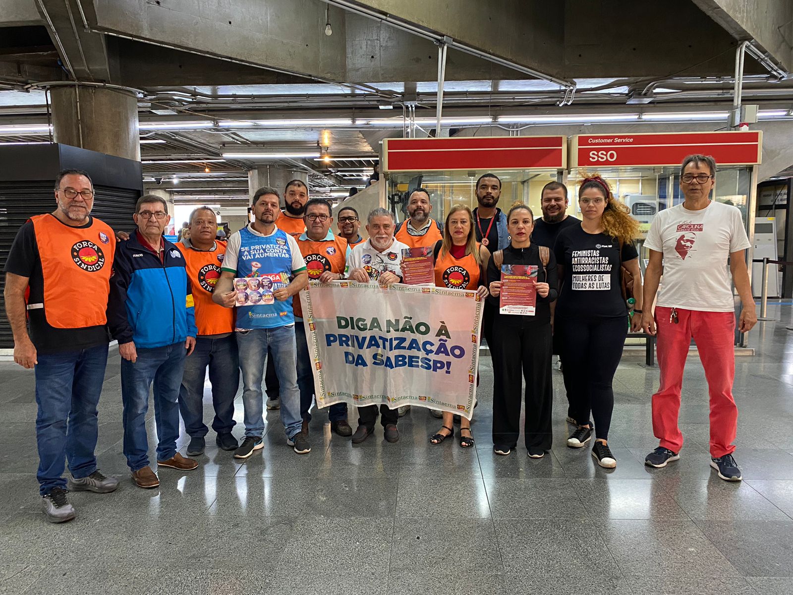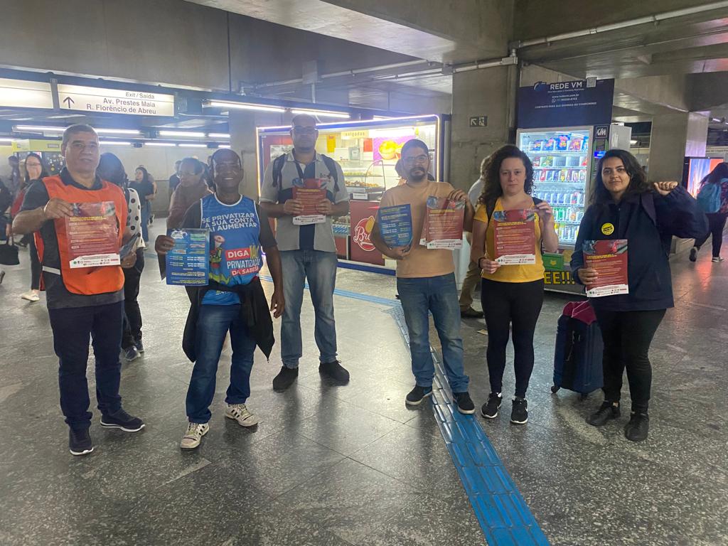 Nesta quarta-feira (23), trabalhadores da Sabesp, Metrô e CPTM se reuniram para distribuir nas estações de metrô carta aberta para a população denunciando a intenção do governador Tarcísio de Freitas de privatizar o transporte e o saneamento no estado de São Paulo.