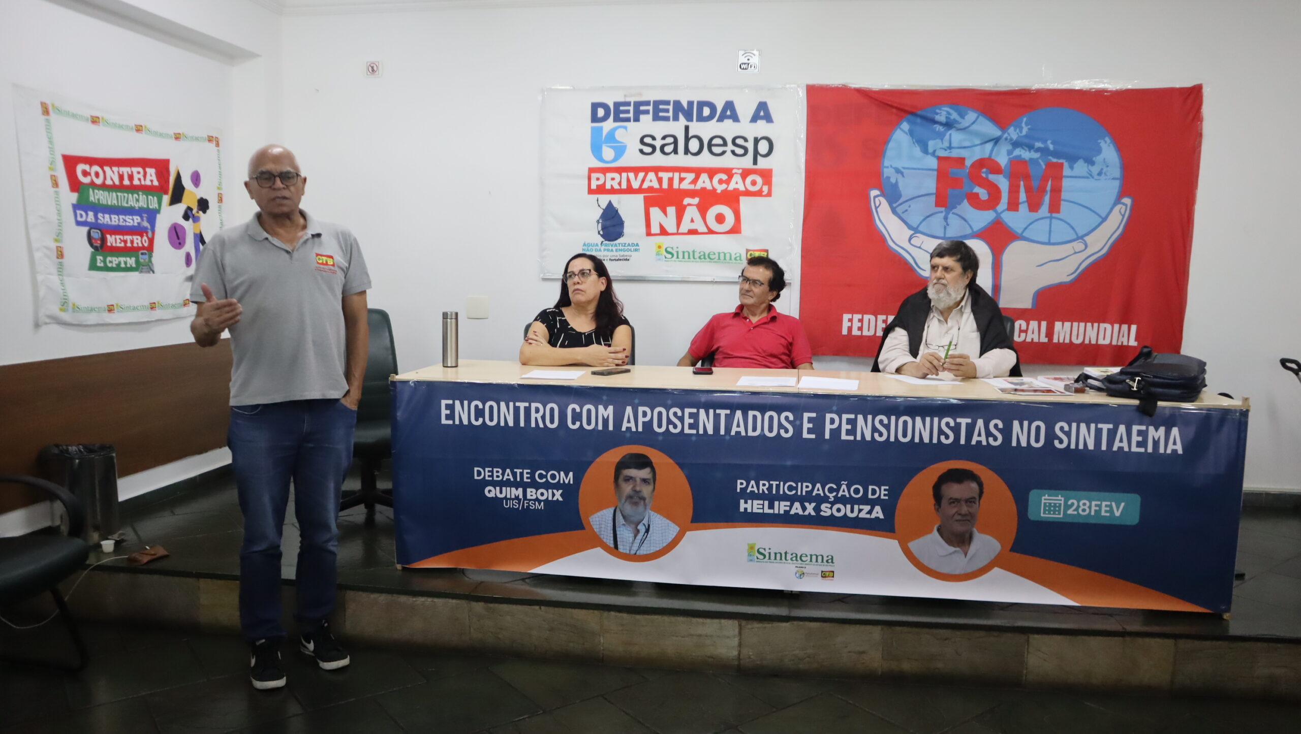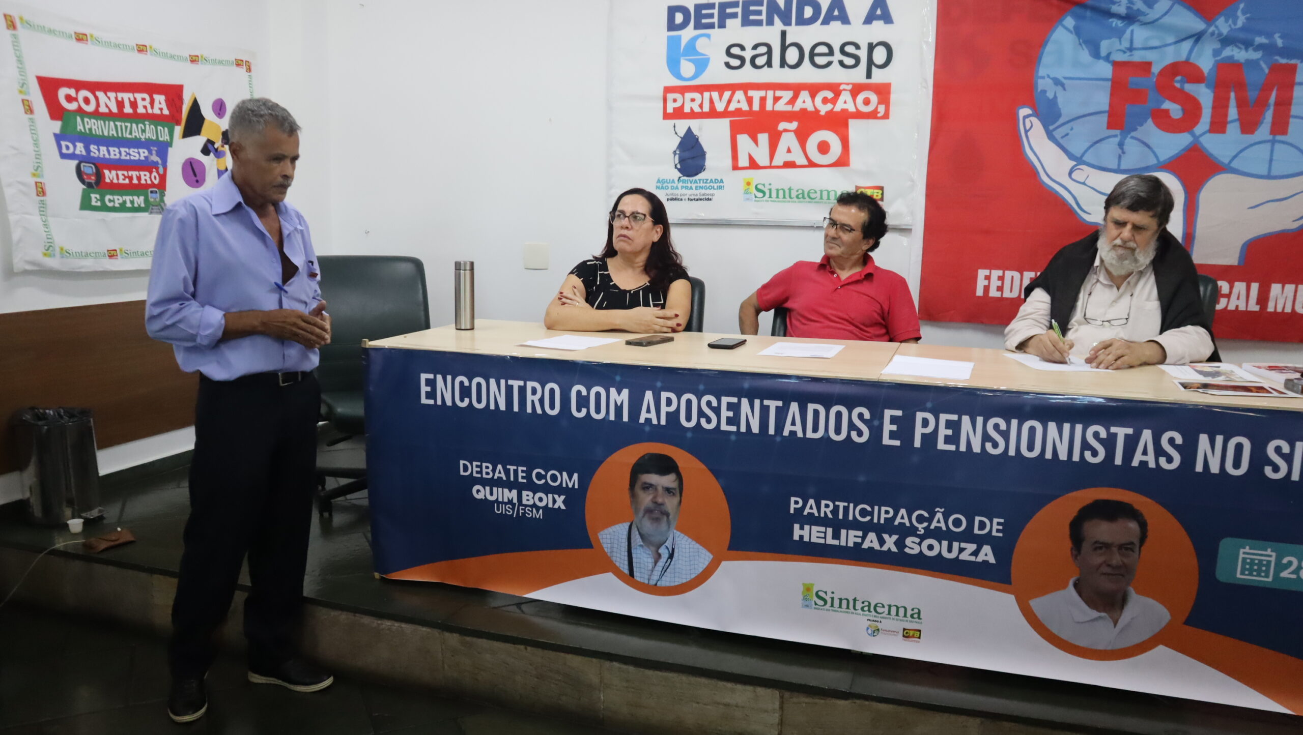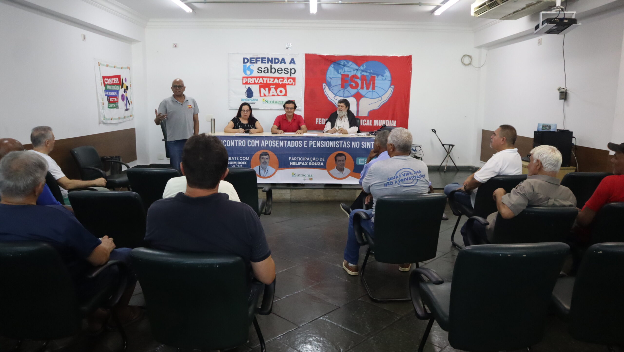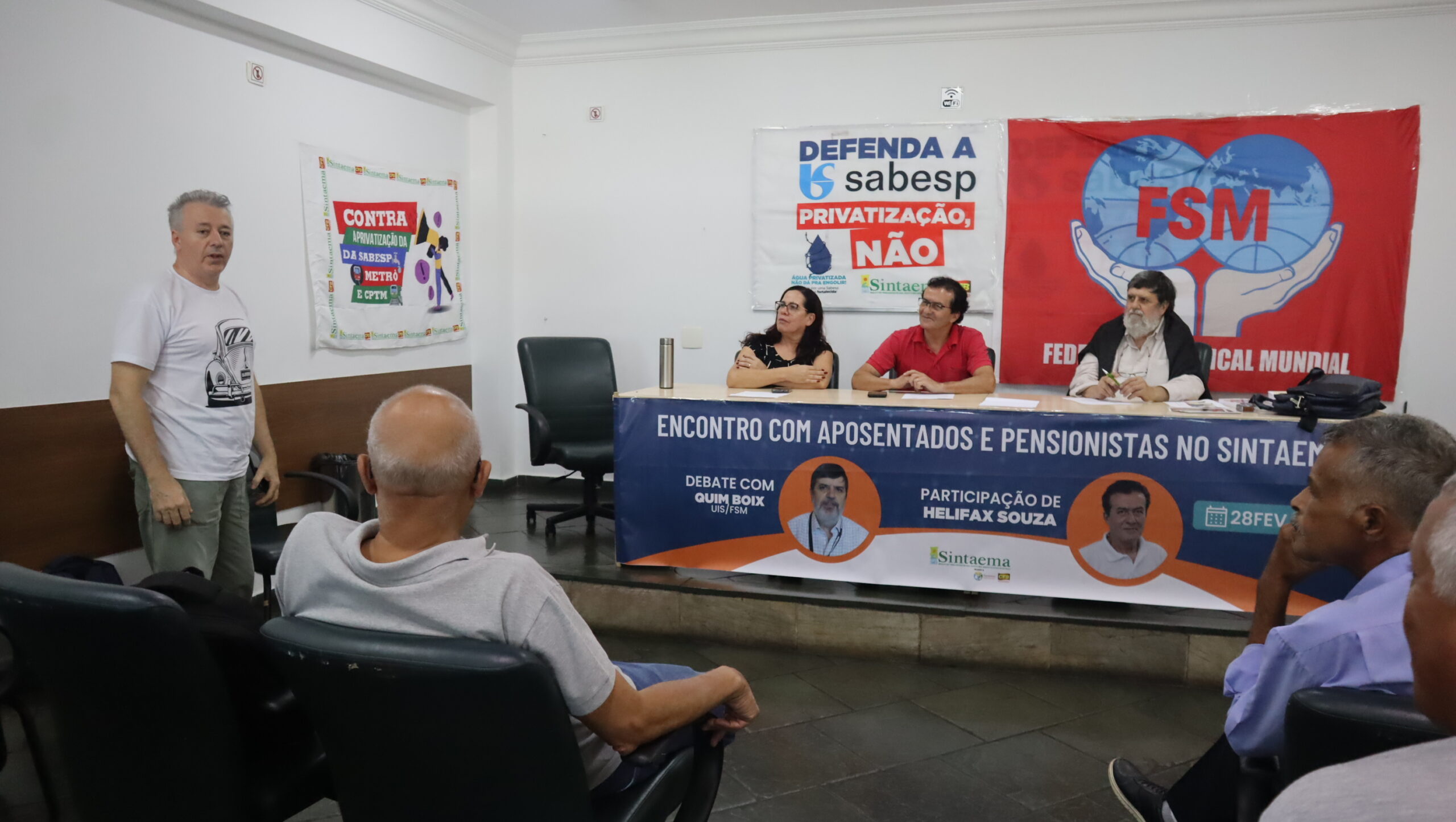 O diretor do Sintaema Helifax Pinto de Souza, trabalhador aposentado da Sabesp, mediou o encontro ocorrido na sede do Sintaema. Para a ocasião, Quim Boix preparou uma palestra sobre a realidade dos aposentados e pensionistas em diversos países.