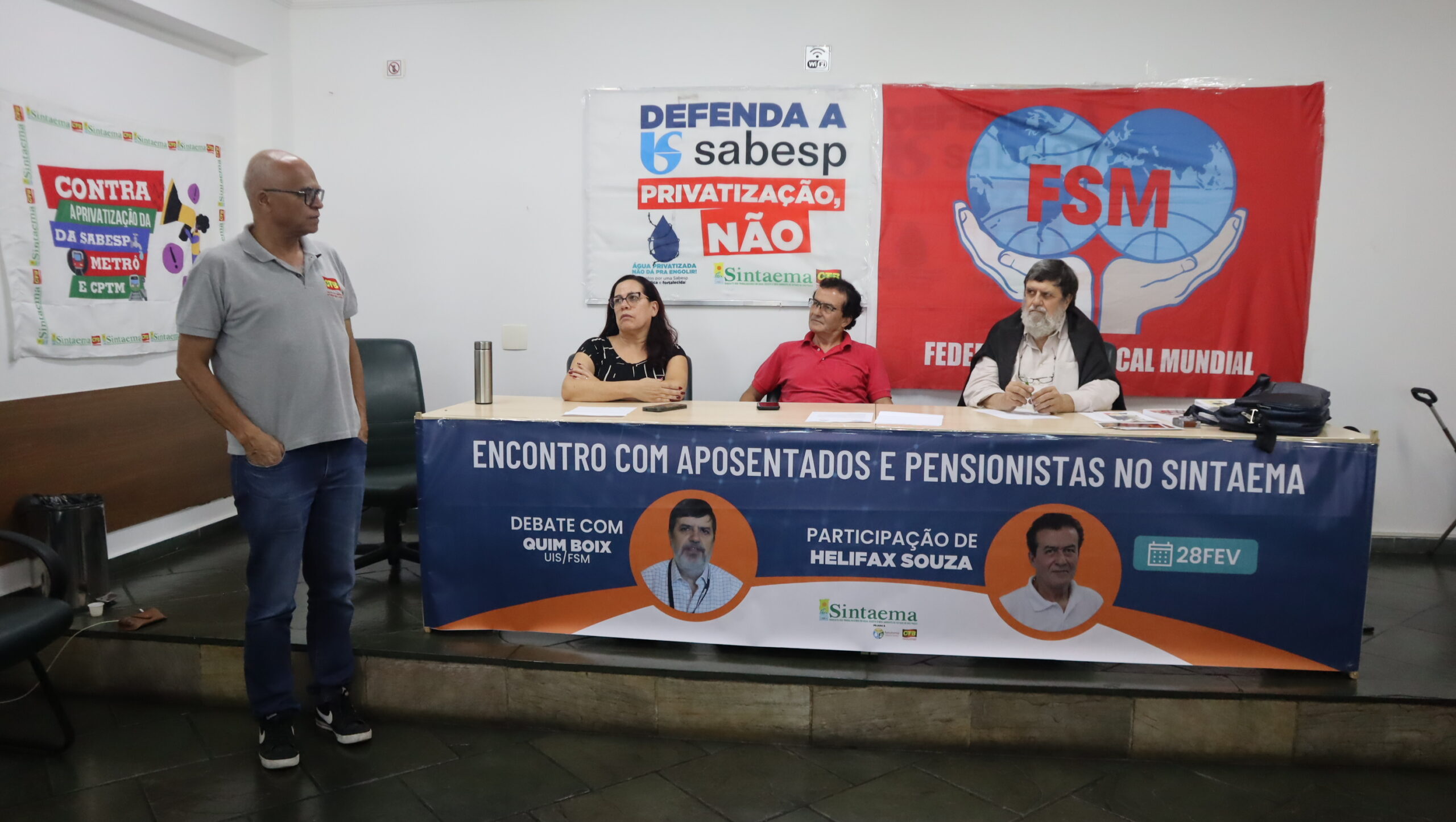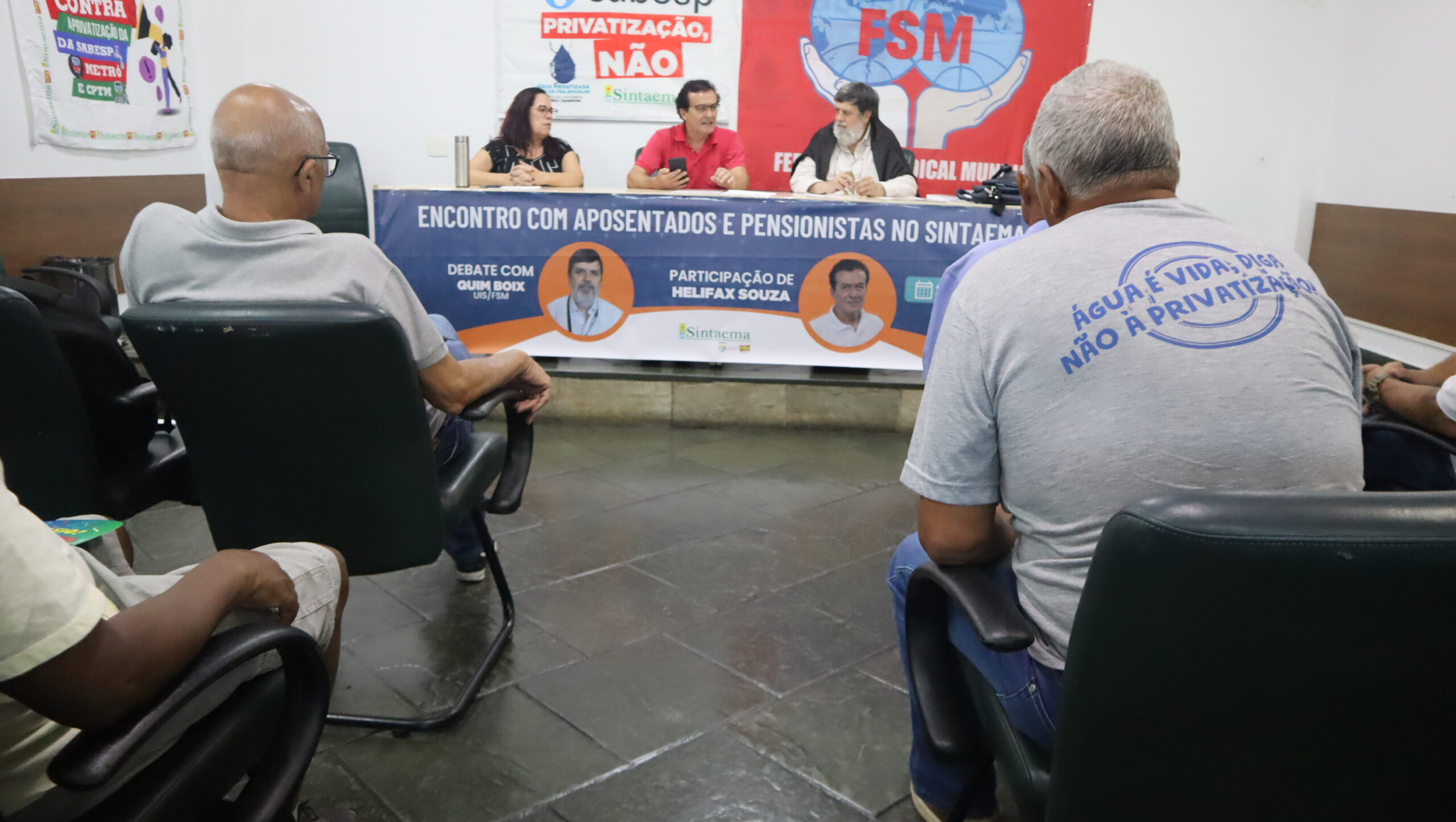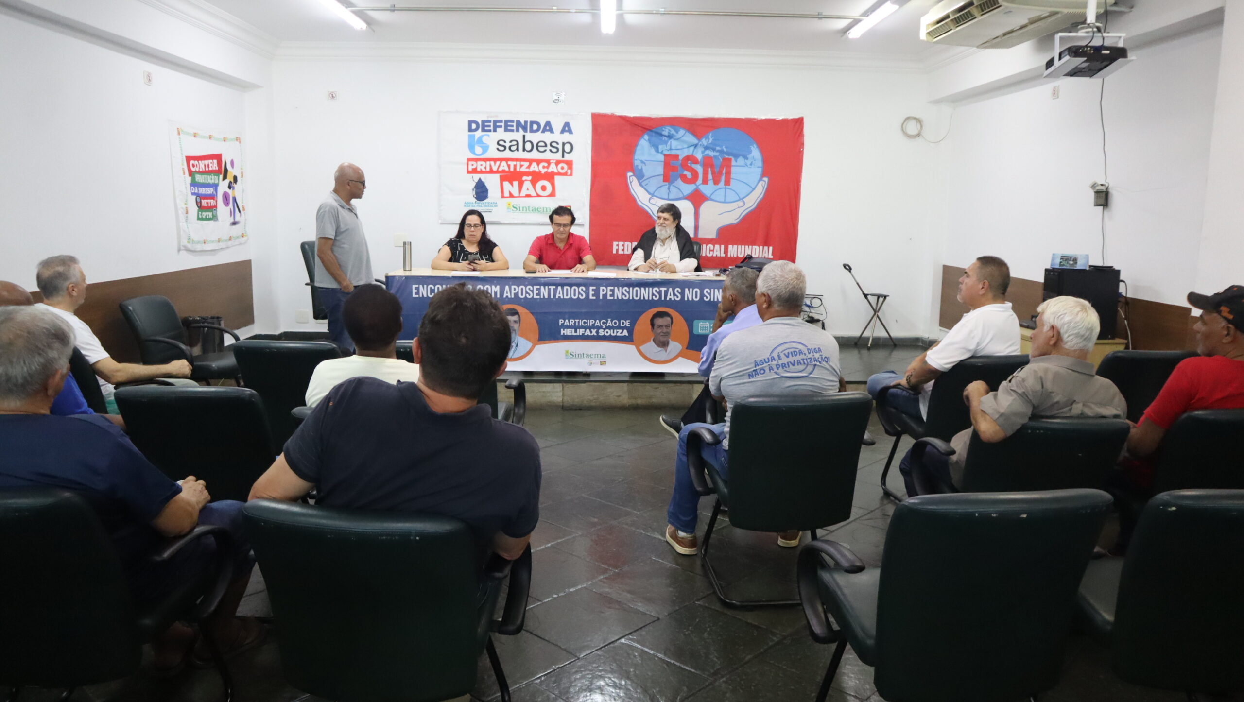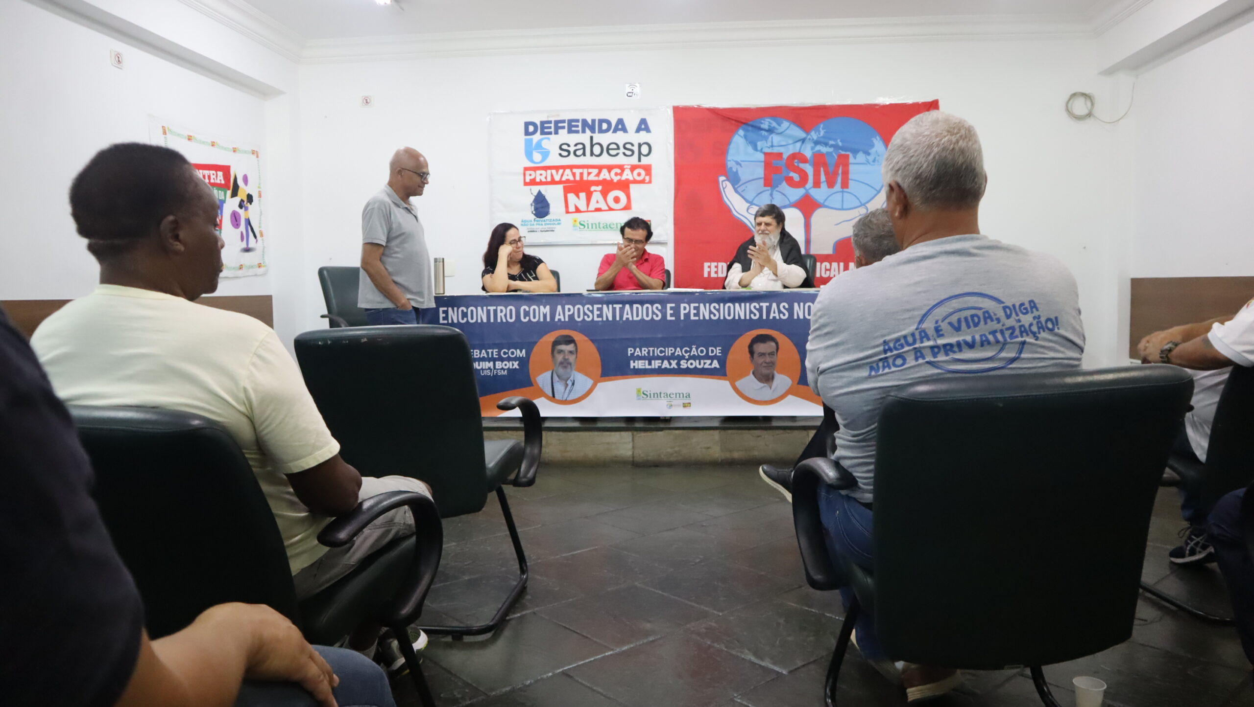 O diretor do Sintaema Helifax Pinto de Souza, trabalhador aposentado da Sabesp, mediou o encontro ocorrido na sede do Sintaema. Para a ocasião, Quim Boix preparou uma palestra sobre a realidade dos aposentados e pensionistas em diversos países.