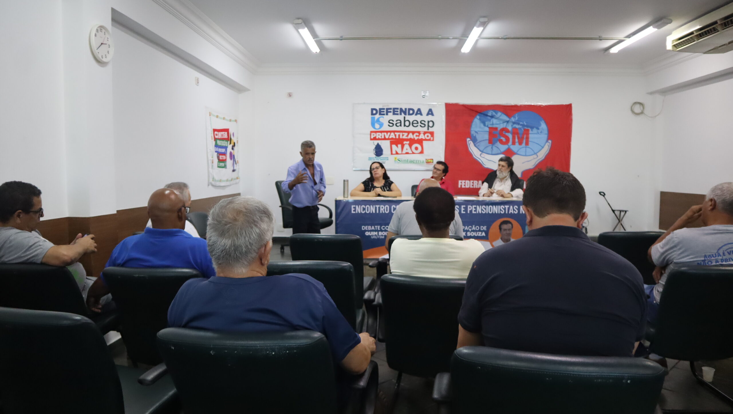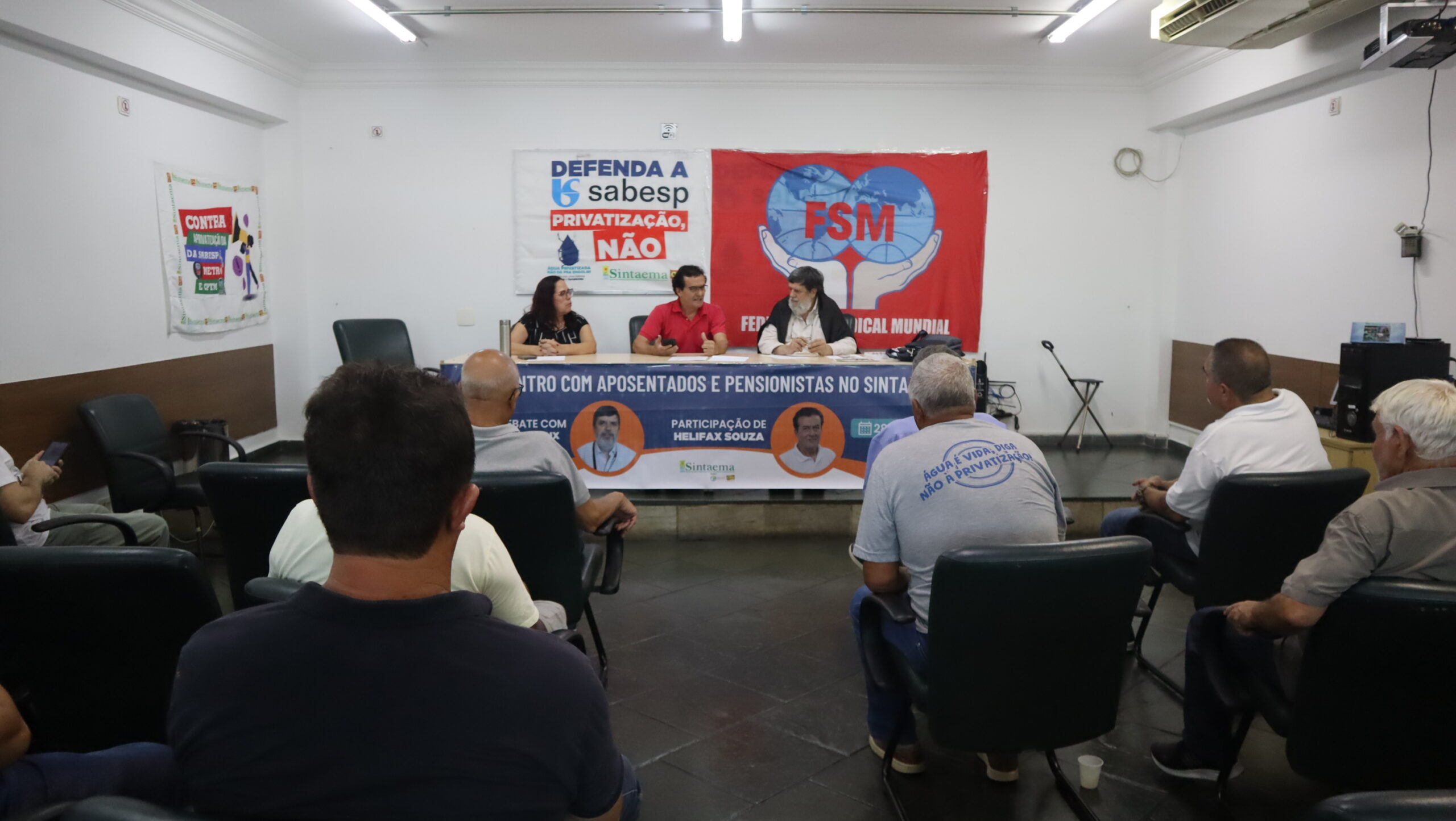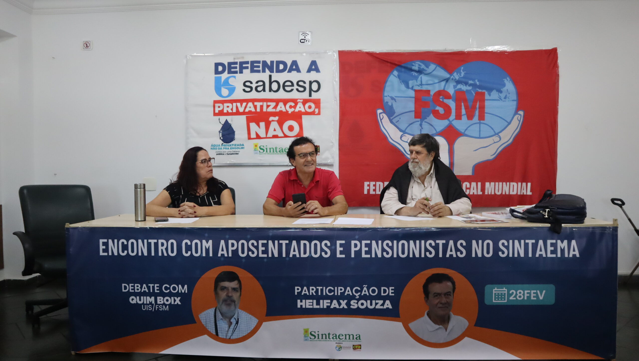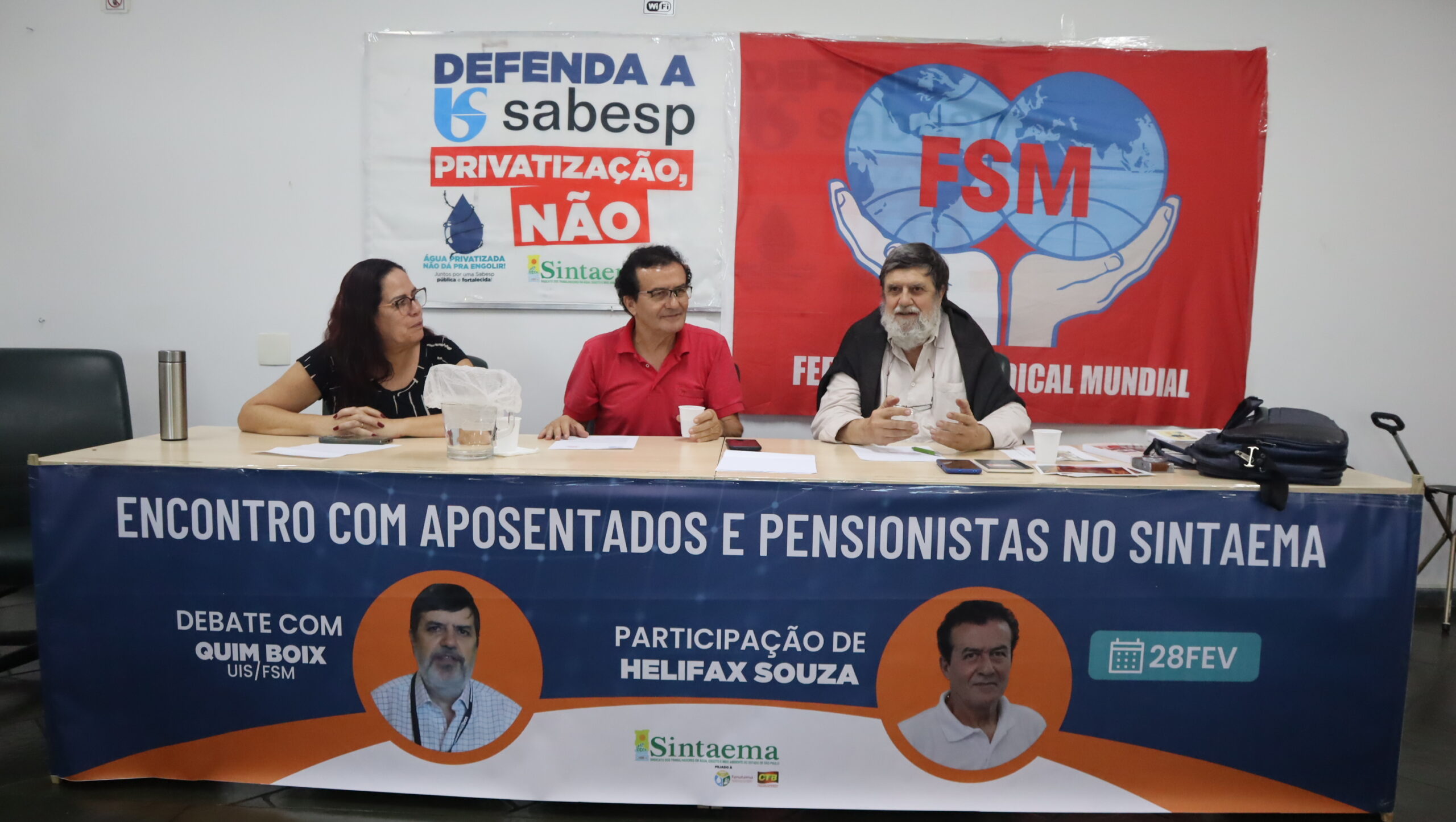 O diretor do Sintaema Helifax Pinto de Souza, trabalhador aposentado da Sabesp, mediou o encontro ocorrido na sede do Sintaema. Para a ocasião, Quim Boix preparou uma palestra sobre a realidade dos aposentados e pensionistas em diversos países.