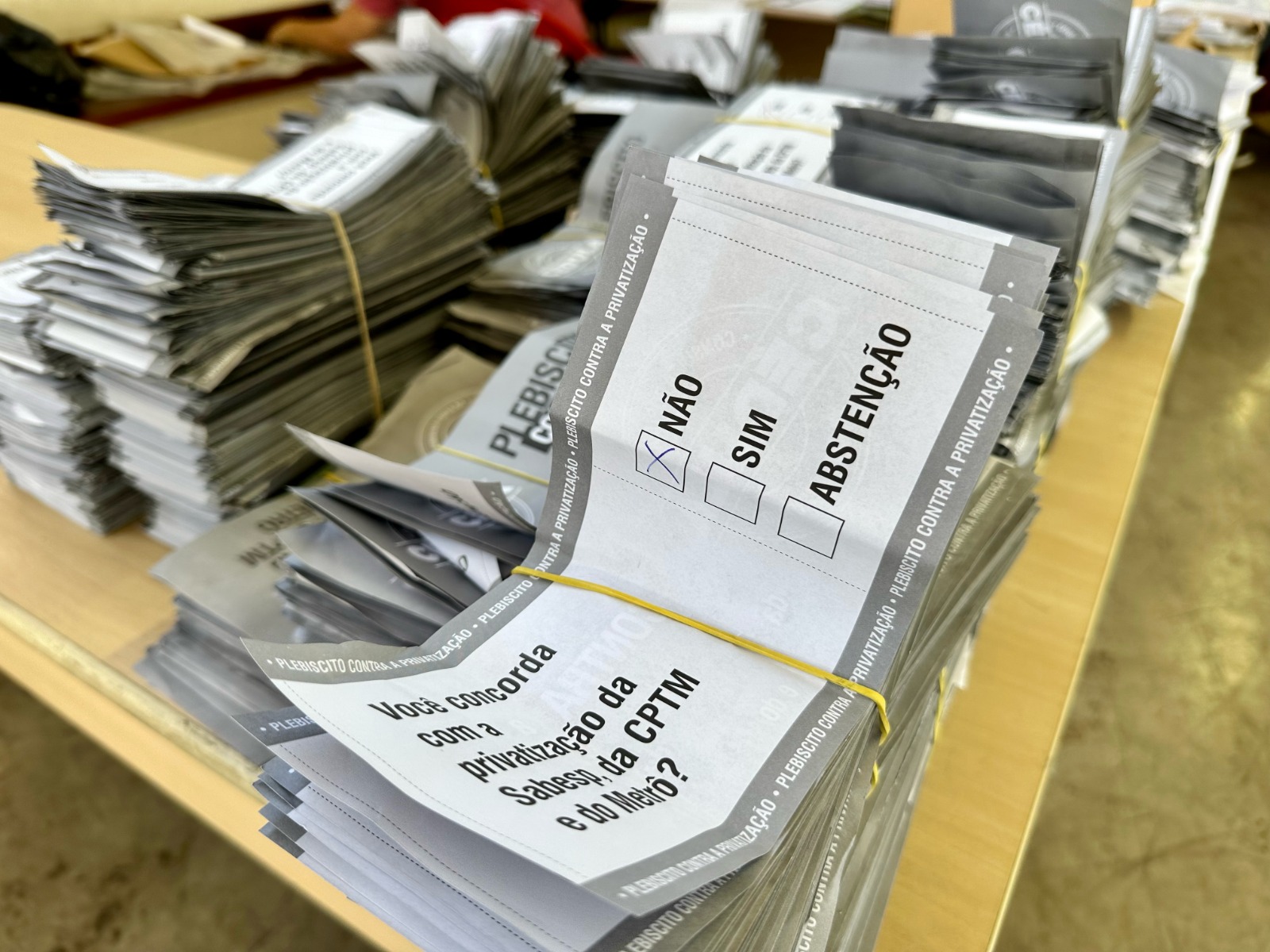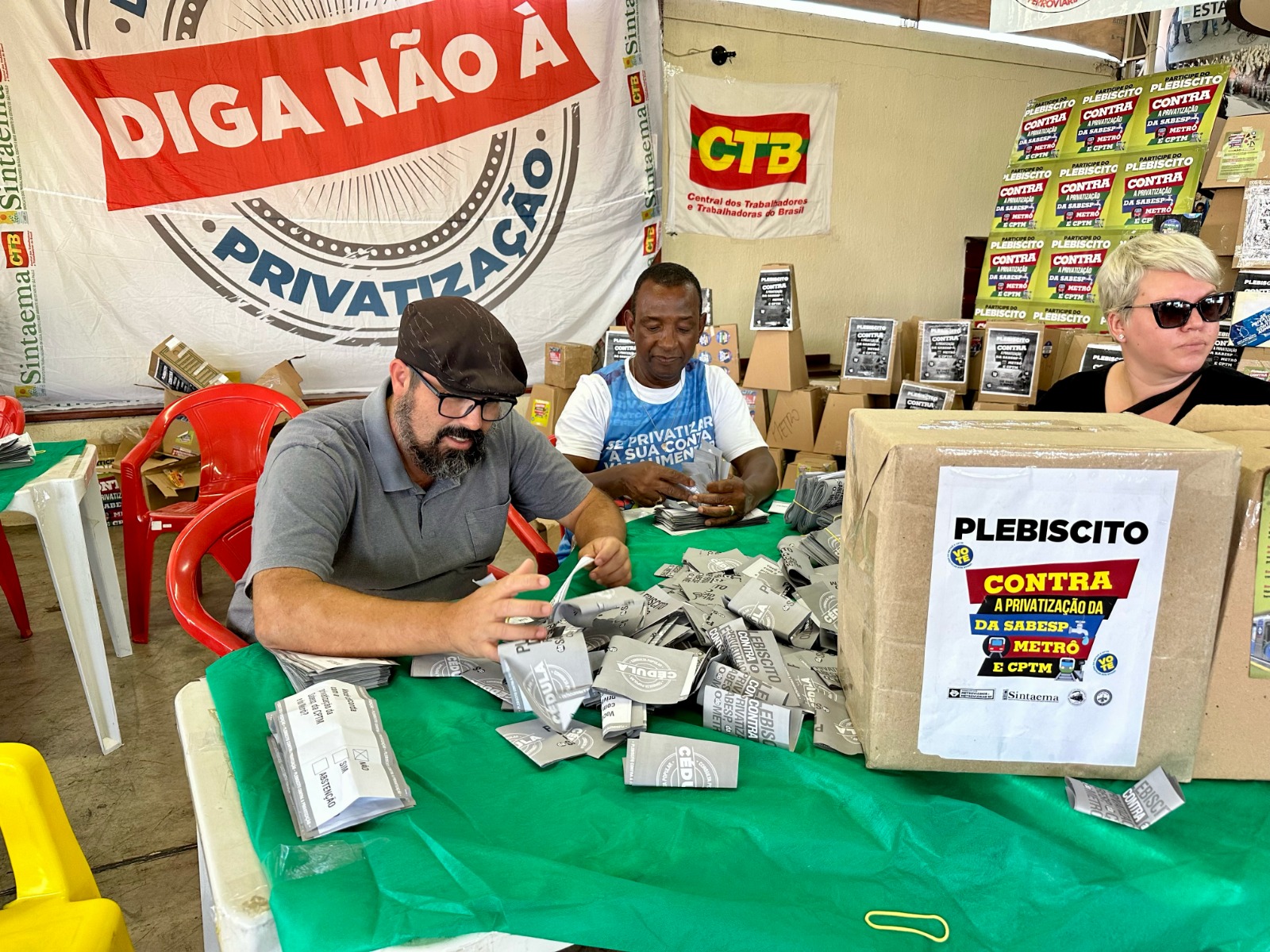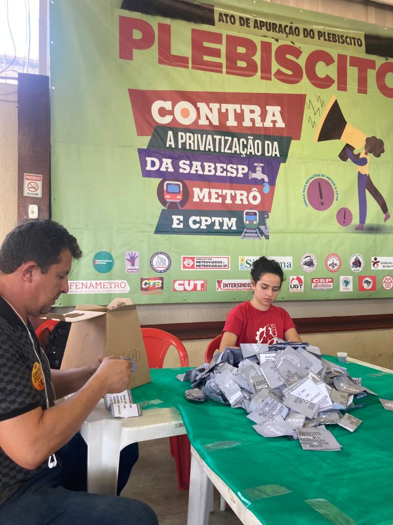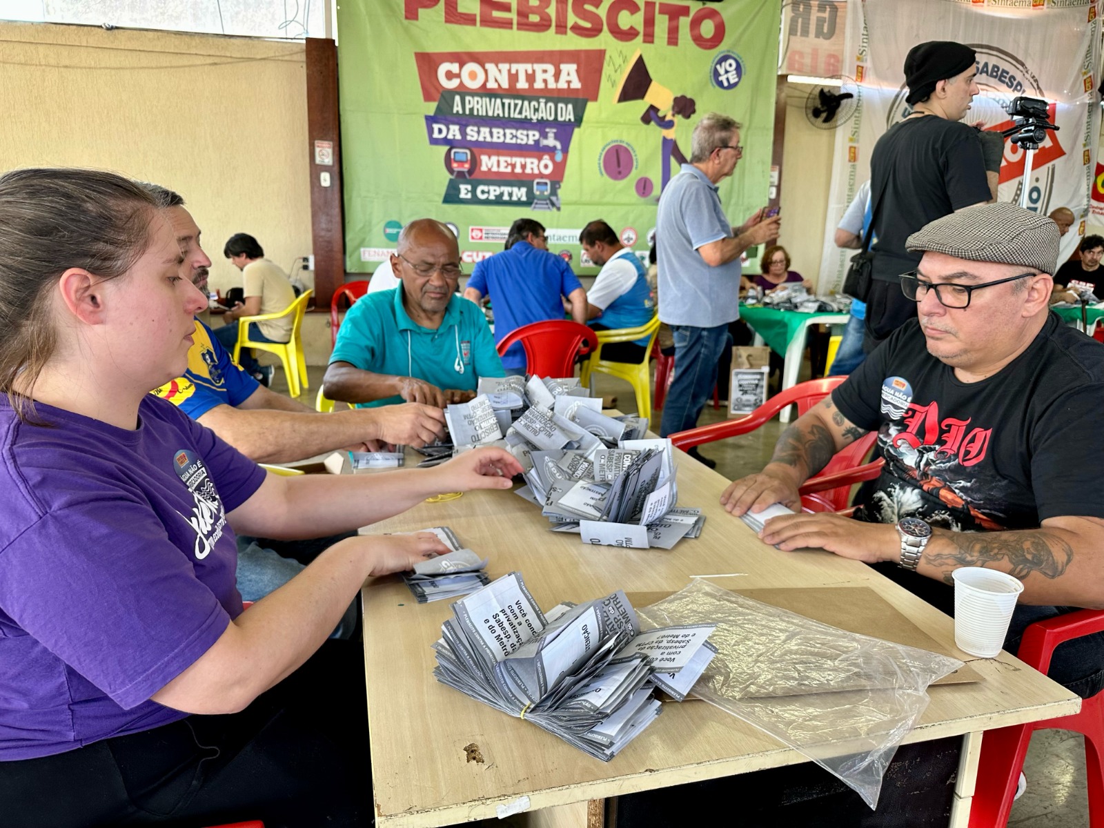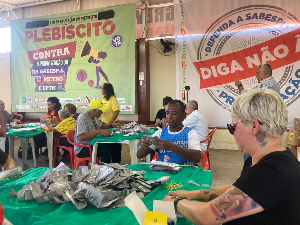 Trabalhadores (as) da Sabesp, Metrô e CPTM iniciaram nesta terça-feira (7), na sede do Sintaema, a contagem dos votos do plebiscito popular que consultou a população sobre o projeto de privatização dos serviços essenciais no estado de São Paulo.