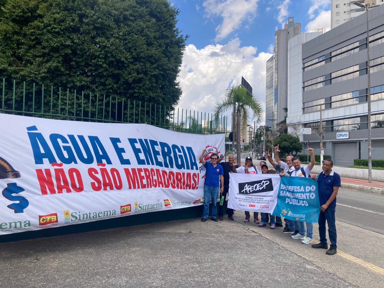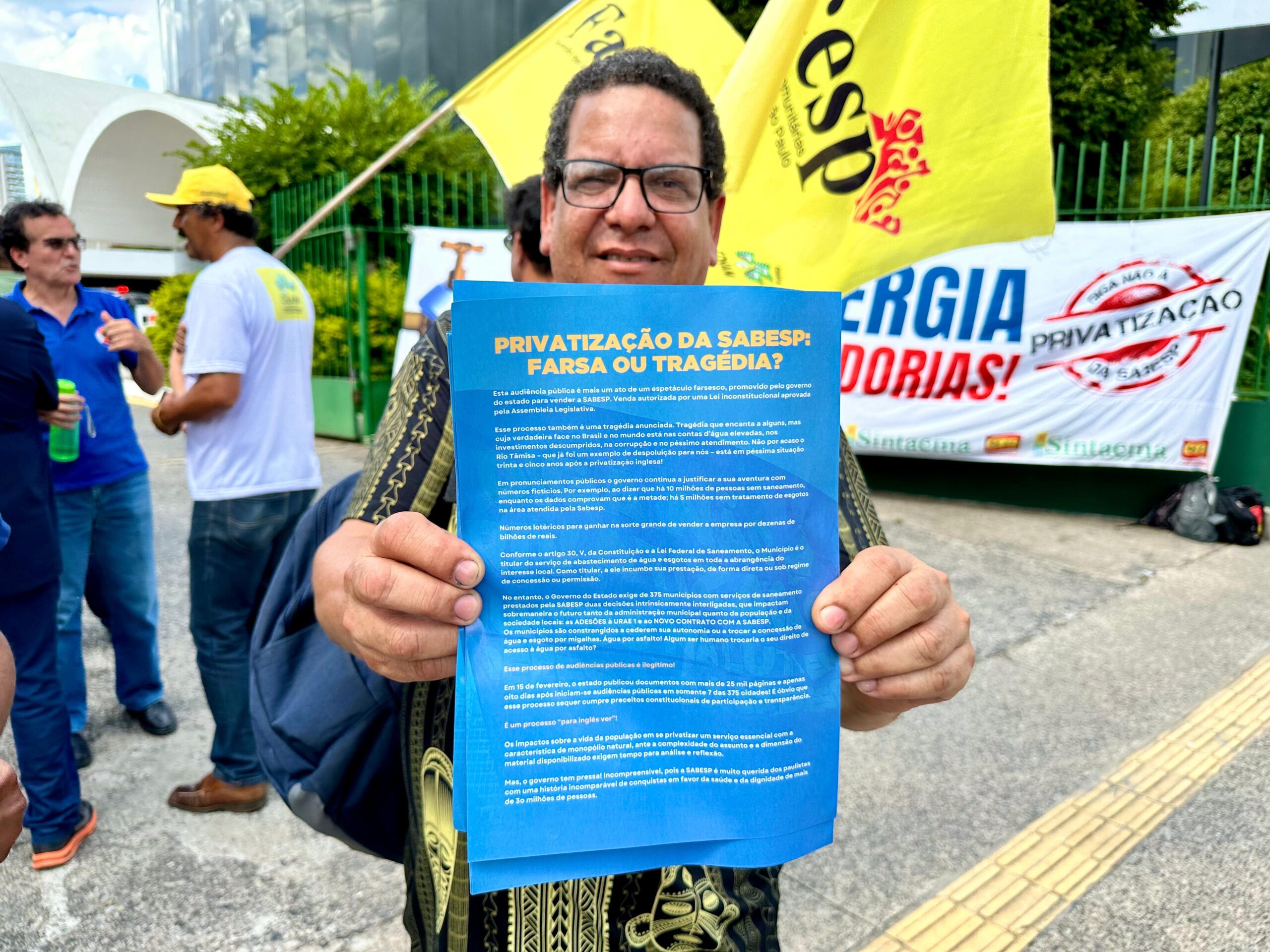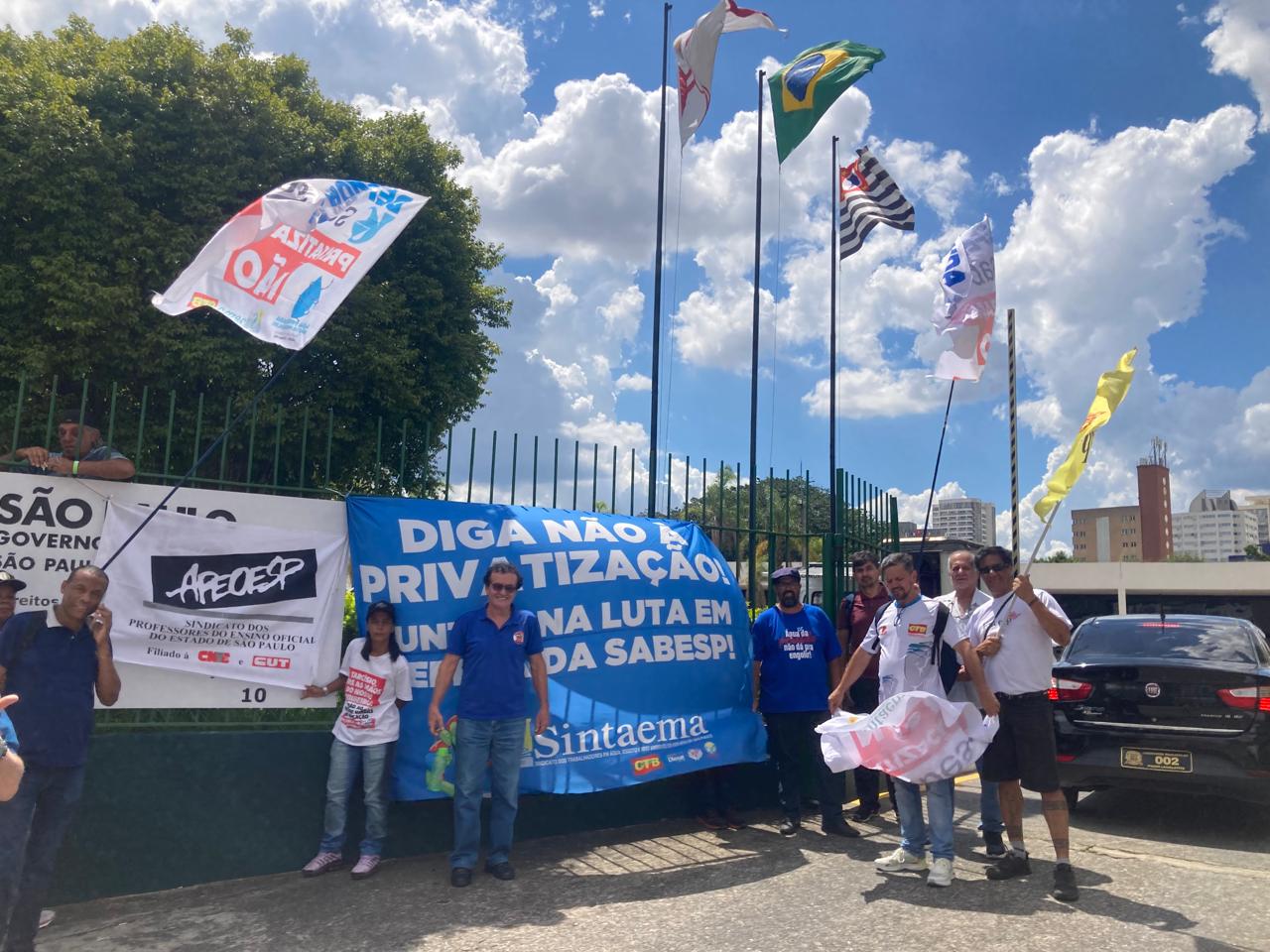 A direção do Sintaema realizou na sexta-feira (23) protesto no Memorial da América Latina quando classificou de farsa as audiências públicas convocadas pelo governador Tarcísio de Freitas sobre a privatização da Sabesp.