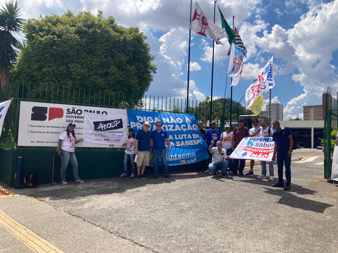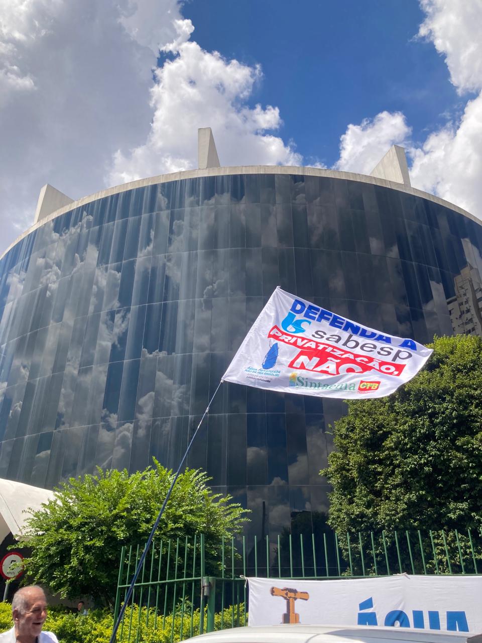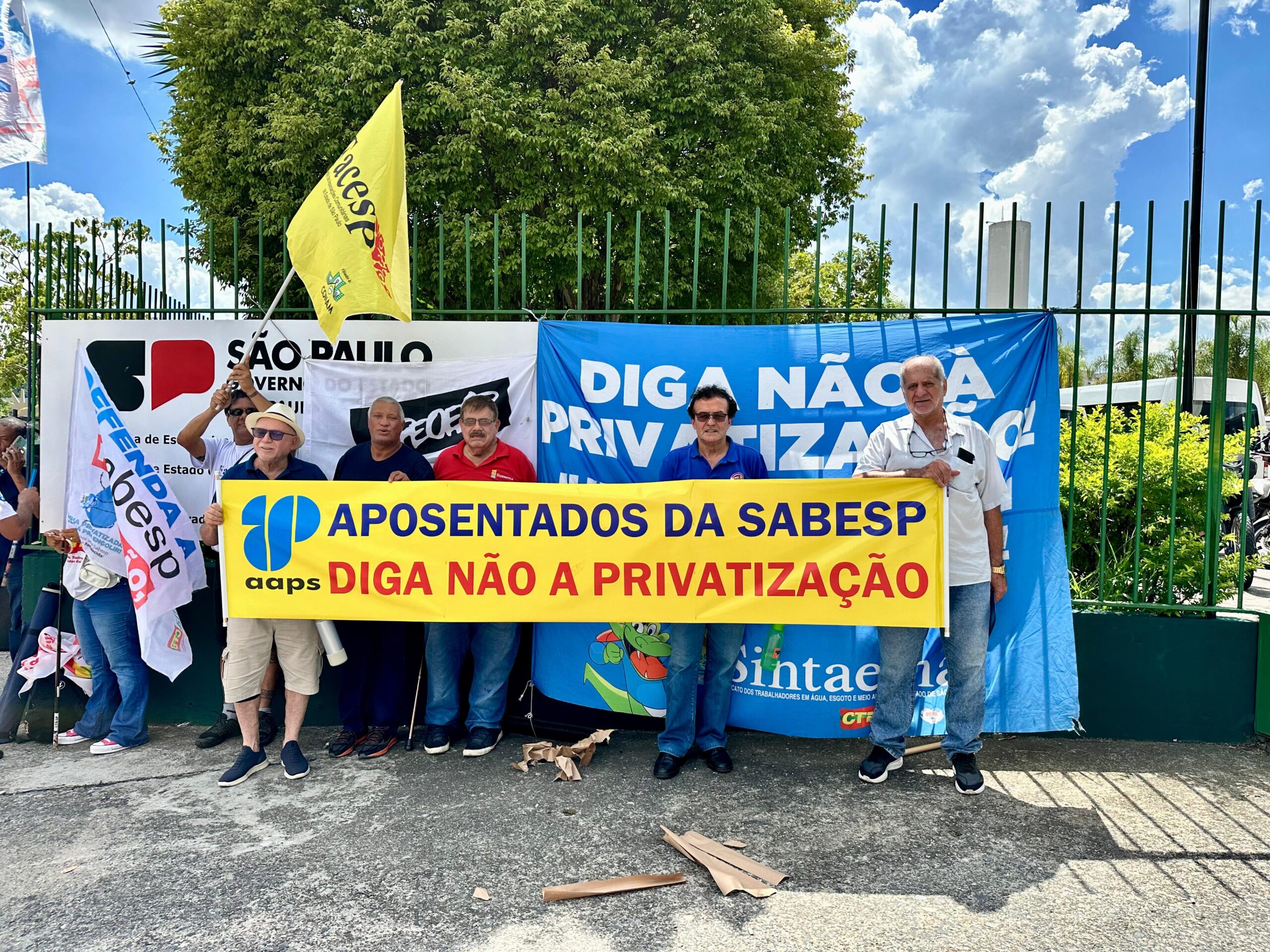 A direção do Sintaema realizou na sexta-feira (23) protesto no Memorial da América Latina quando classificou de farsa as audiências públicas convocadas pelo governador Tarcísio de Freitas sobre a privatização da Sabesp.