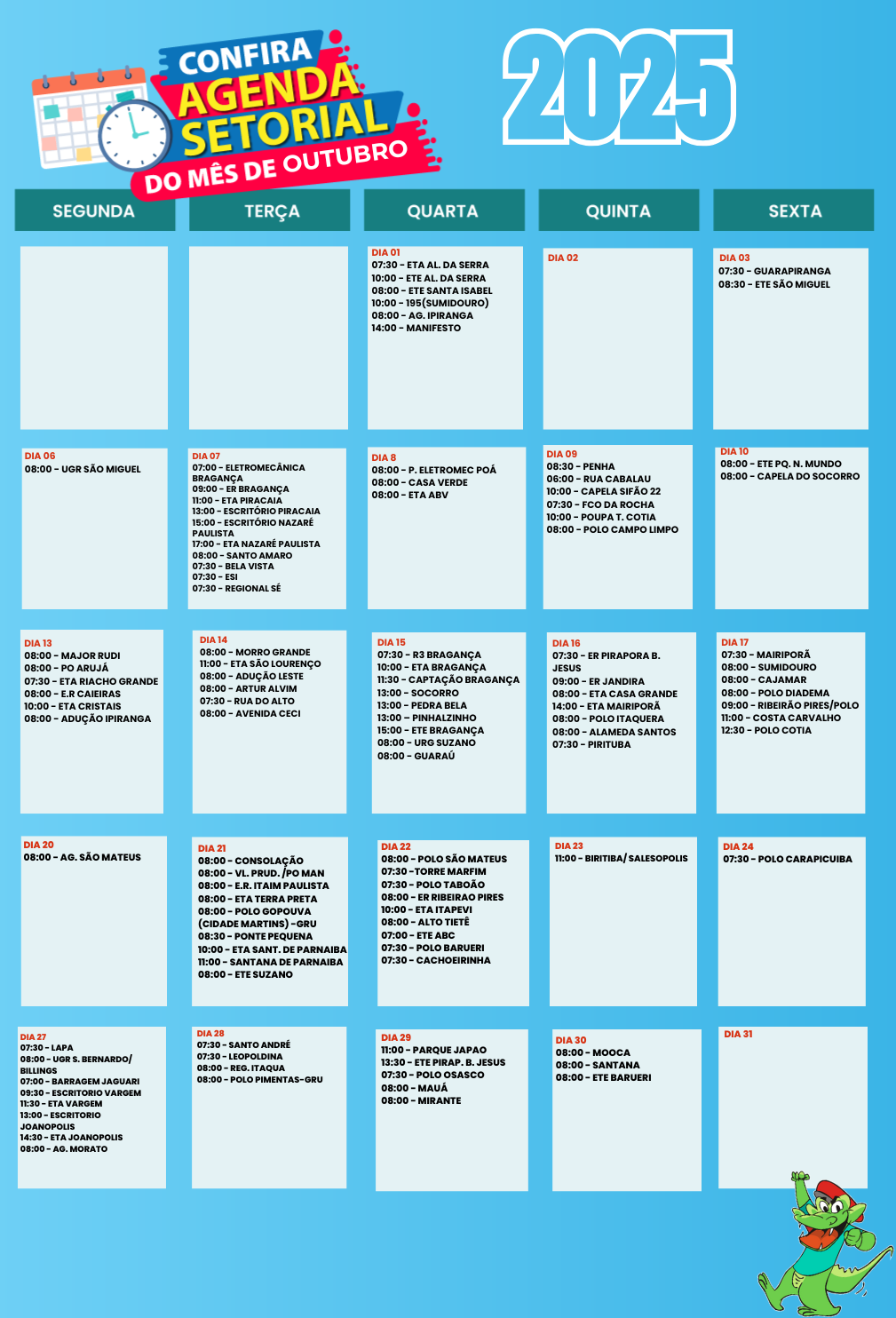 Confira abaixo os dias e horários das reuniões setoriais do mês de outubro: