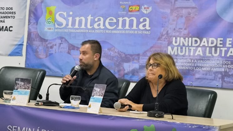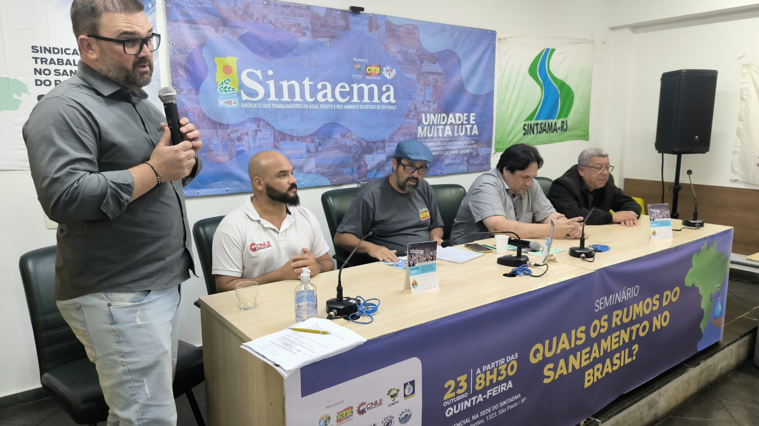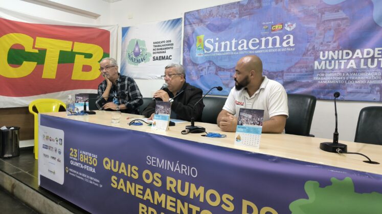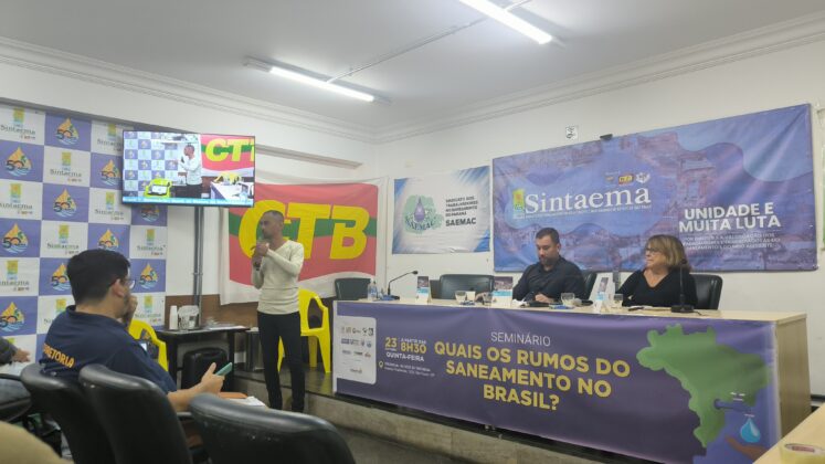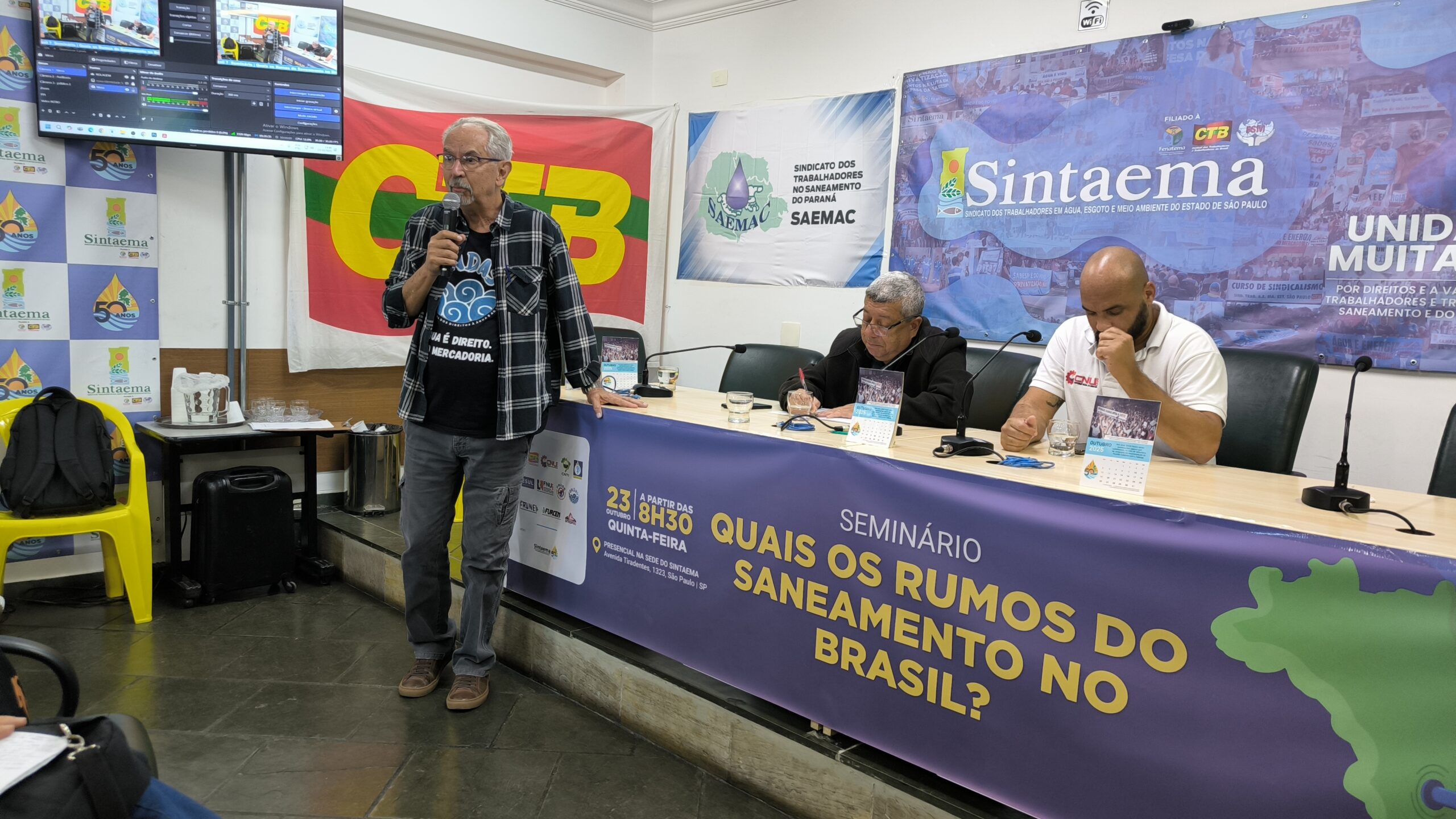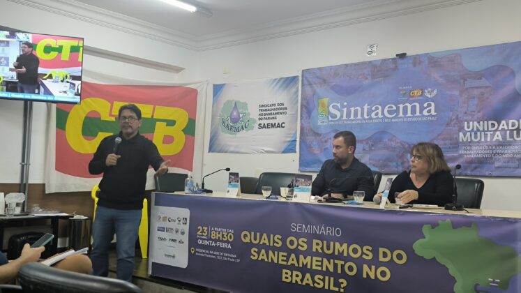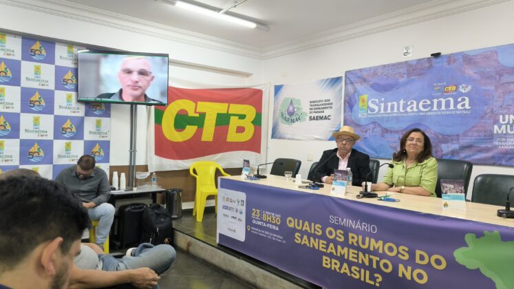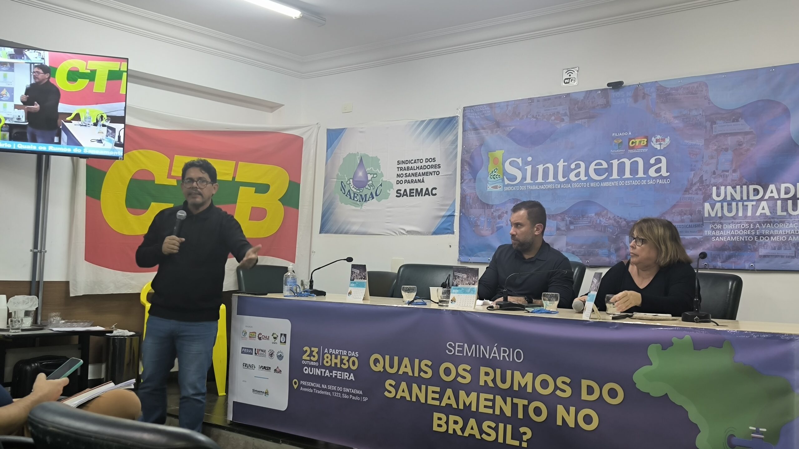 A parte da tarde do Seminário Nacional “Quais os Rumos do Saneamento?” — organizado pela Fenatema, FNU, CTB, CNU, CNTI, Frente Nacional pelo Saneamento Ambiental, Ondas, FESUL, FRUSE, FRUNE, FURCEN e SINTICOPMG, com o apoio do Sintaema — foi marcada por fortes manifestações políticas e pelo compromisso renovado de lutar contra a privatização da água e em defesa do direito universal ao saneamento público e de qualidade.